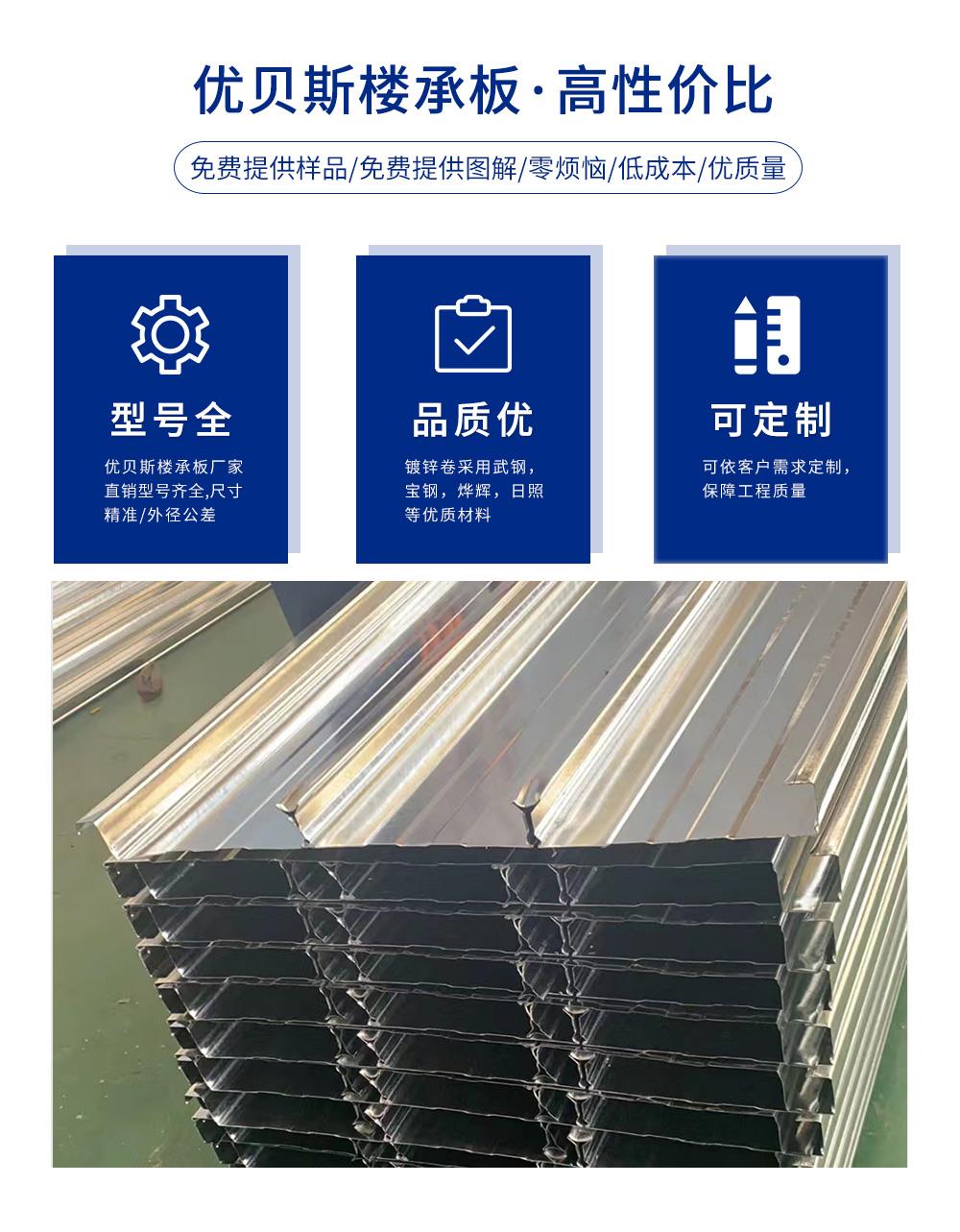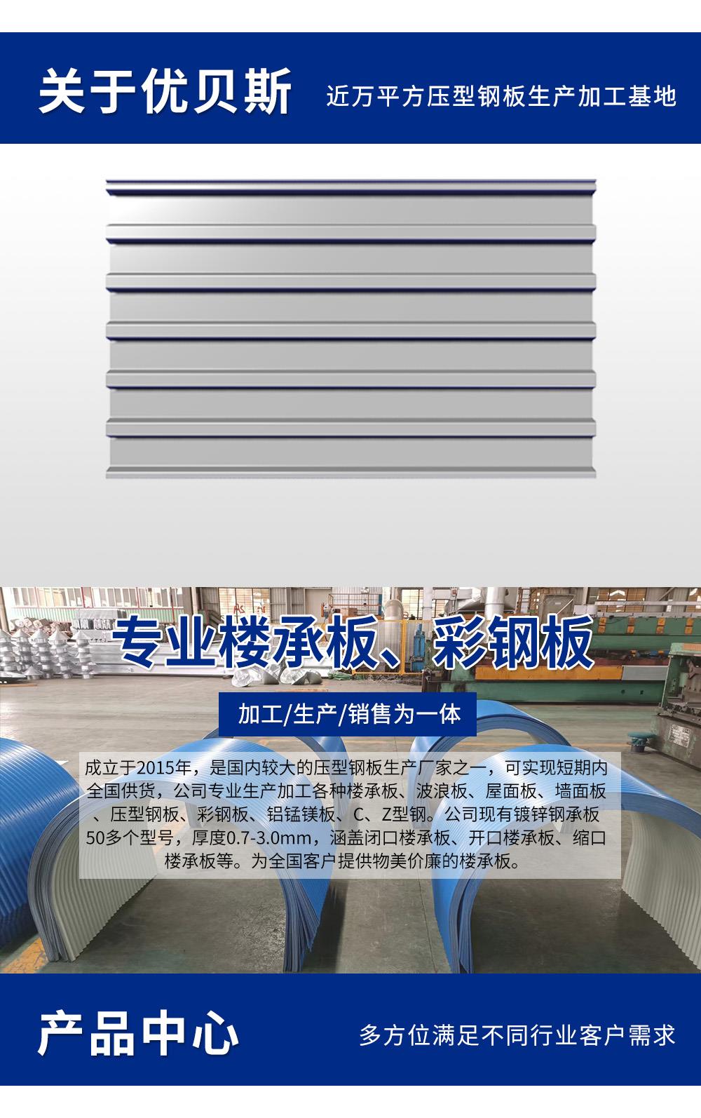 優(yōu)貝斯樓承板公司是長三角樓承鍍鋅樓承板、彩色壓型鋼板生產(chǎn)基地,主要產(chǎn)品有閉口樓承板、開口樓承板、壓型鋼板組合樓板、屋面板、墻面板。厚度足,免費拿樣。拿樣電話:178-0250-2786